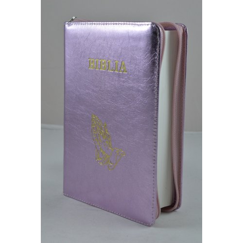 Biblia din piele, marime medie, mov sidefat, fermoar, simbol maini in rugaciune, cuv. lui Isus cu rosu [053]