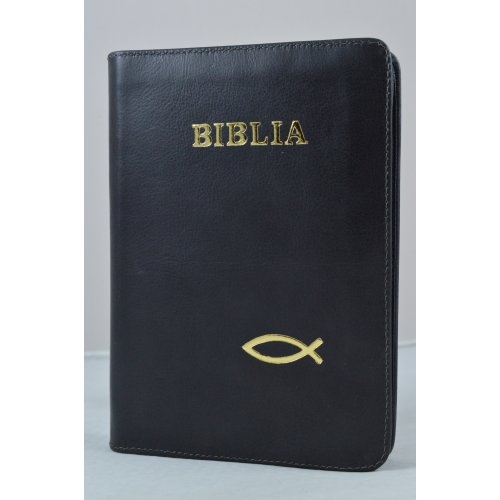 Biblia din piele, marime medie, neagra, fermoar, simbol peste, cuv. lui Isus cu rosu [053]