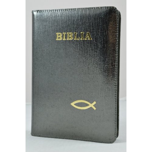 Biblia din piele, marime medie, oliv lucios, fermoar, simbol peste, cuv. lui Isus cu rosu [053]