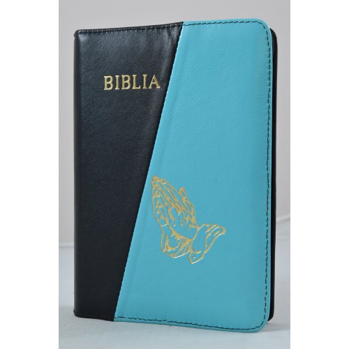 Biblia din piele, marime medie, negru cu albastru deschis, fermoar, simbol maini in ruga, cuv. lui Isus cu rosu [053]