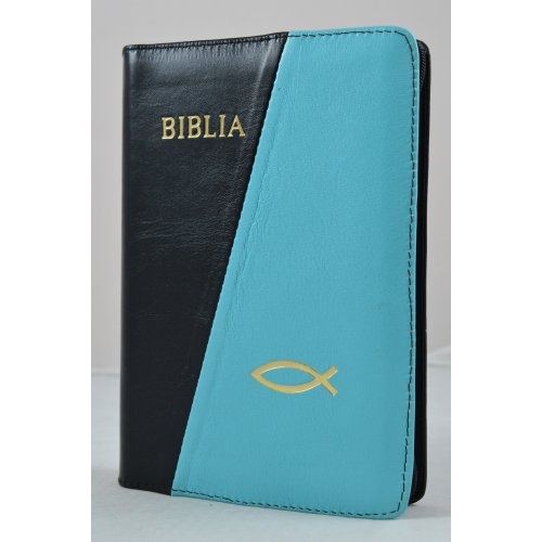Biblia din piele, marime medie, negru cu albastru deschis, fermoar, simbol peste, cuv. lui Isus cu rosu [053]
