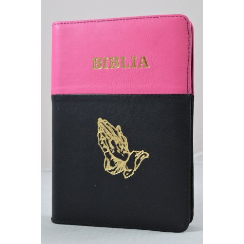 Biblia din piele, marime medie, negru cu roz bombon , fermoar, simbol maini in ruga, cuv. lui Isus cu rosu [053]