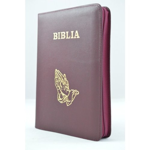 Biblia din piele, marime medie, visinie cu maini , fermoar, aurita, cuv. lui Isus cu rosu [052]