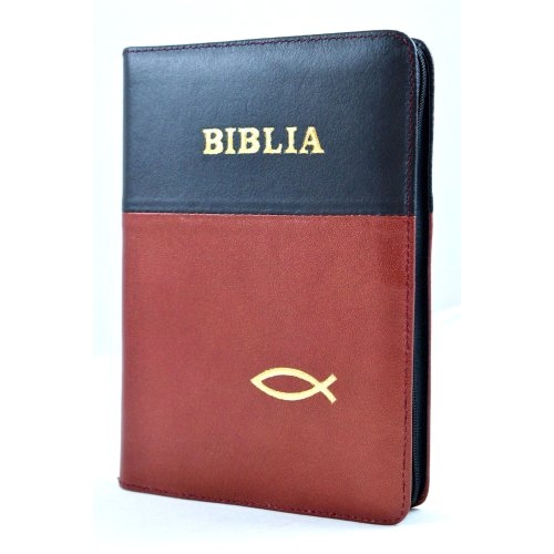 Biblia din piele, marime medie, negru - stacojiu, fermoar, simbol peste, cuv. lui Isus cu rosu [053]
