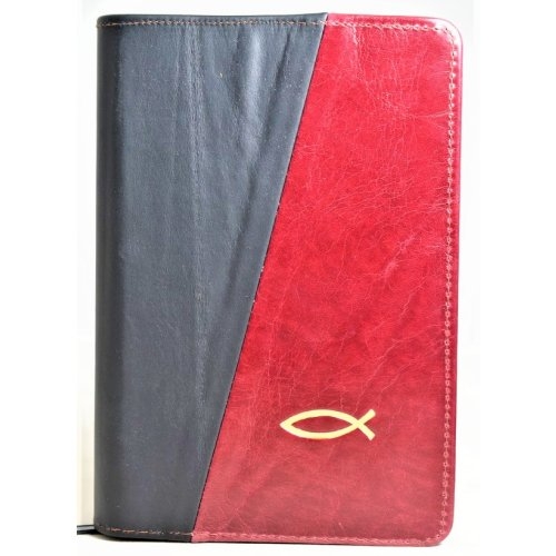 Biblia din piele, marime medie, negru/visiniu, fermoar, simbol peste, cuv. lui Isus cu rosu [053]