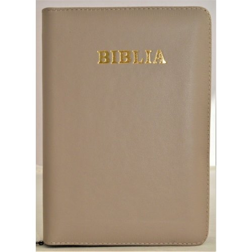 Biblia din piele, marime medie, nuanta crem inchis, fermoar, cuv. lui Isus cu rosu [053]
