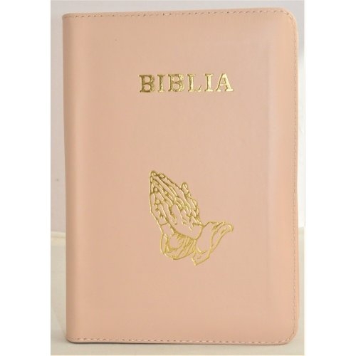 Biblia din piele, marime medie, nuanta roz pudra, fermoar, simbol maini in ruga, cuv. lui Isus cu rosu [053]