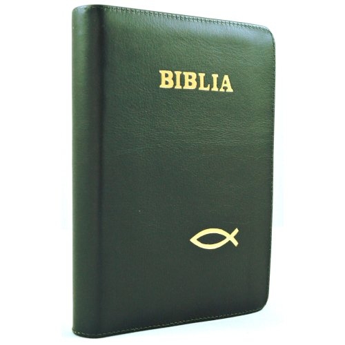 Biblia din piele, marime medie, oliv inchis, fermoar, simbol peste, cuv. lui Isus cu rosu [053]