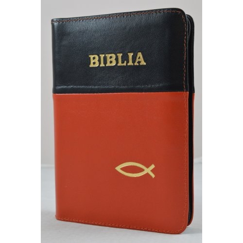 Biblia din piele, marime medie, rosu coral cu negru, fermoar, simbol peste, cuv. lui Isus cu rosu [053]