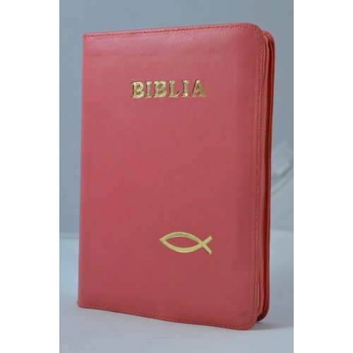 Biblia din piele, marime medie, rosu coral, fermoar, aurita, cu peste, cuv. lui Isus cu rosu [052]