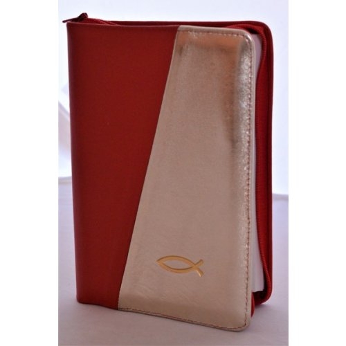 Biblia din piele, marime medie, rosu cu auriu sidefat fermoar, simbol peste, cuv. lui Isus cu rosu [053]