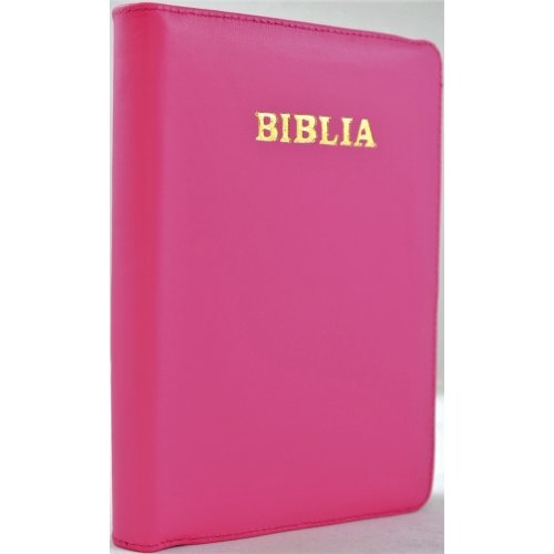 Biblia din piele, marime medie, roz bombon, fermoar, margini aurite,, cuv. lui Isus cu rosu [052]