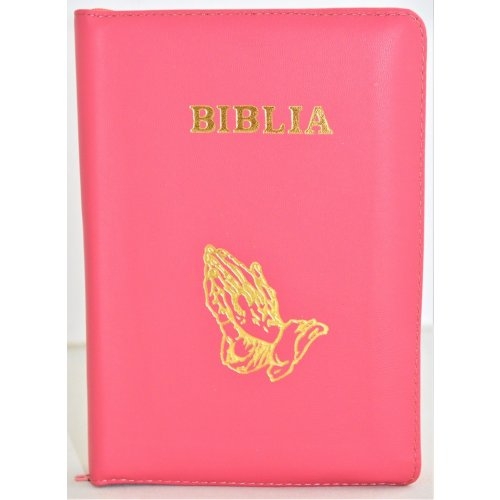 Biblia din piele, marime medie, roz coral, fermoar, simbol maini in ruga, cuv. lui Isus cu rosu [053]