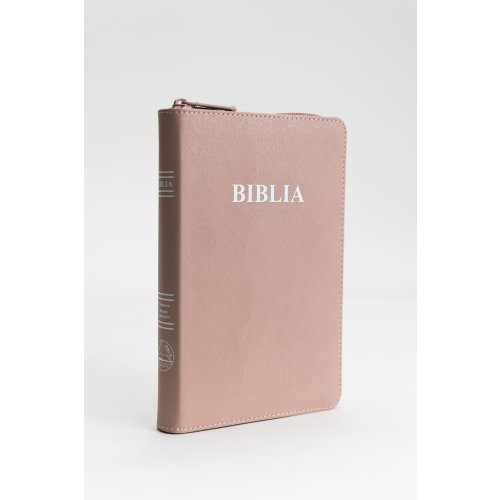 Biblia din piele, marime medie, roz deschis, fermoar, index pe cotor, margini aurii, cuv. lui Isus in rosu [057 ZTI]