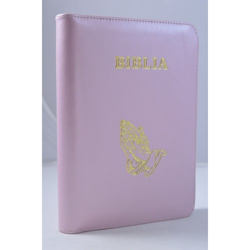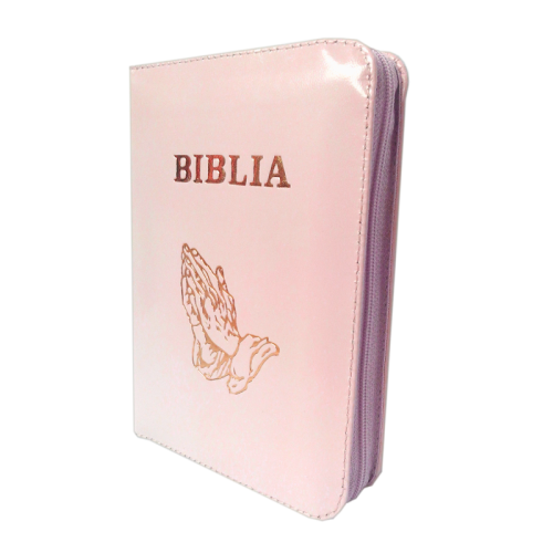 Biblia din piele, marime medie, roz pal, fermoar, cu maini, cuv. lui Isus cu rosu [053]