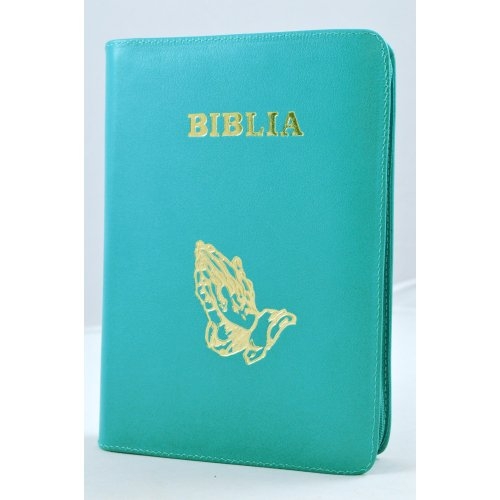 Biblia din piele, marime medie, turcoaz, fermoar, simbol maini, cuv. lui Isus cu rosu [053]