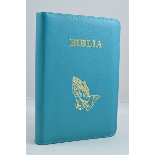 Biblia din piele, marime medie,turcoaz , fermoar, simbol maini in ruga, cuv. lui Isus cu rosu [053]