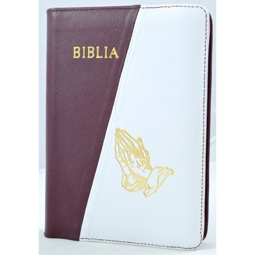 Biblia din piele, marime medie, visiniu / alb, fermoar, simbol peste, cuv. lui Isus cu rosu [053]
