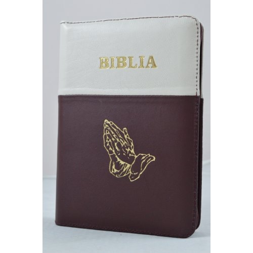 Biblia din piele, marime medie, visiniu cu crem, fermoar, simbol maini in ruga, cuv. lui Isus cu rosu [053]