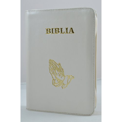 Biblia din piele, medie,alb cu maini, fermoar, aurita, cuv. lui Isus cu rosu [052]