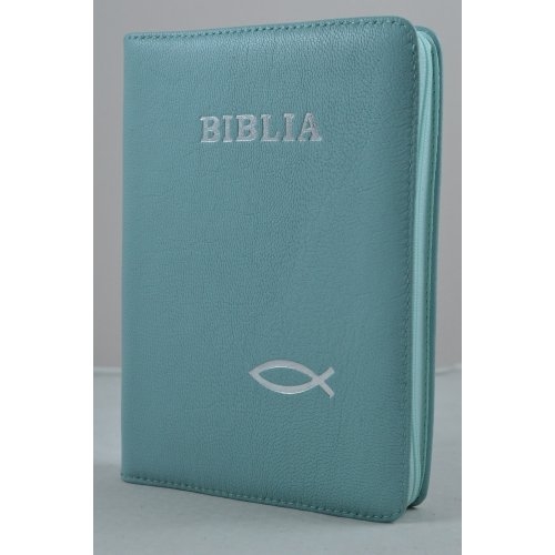 Biblia din piele, medie, albastru ciel, fermoar, argintata, peste cuv. lui Isus cu rosu [052]