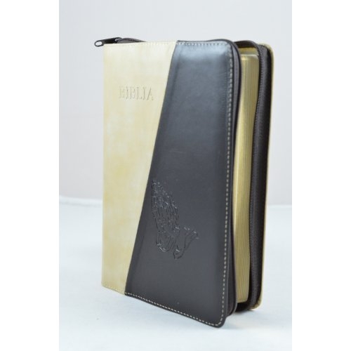 Biblia din piele, medie, bej cu negru, fermoar, aurita, simbol maini in rugaciune, cuv. lui Isus cu rosu [052]