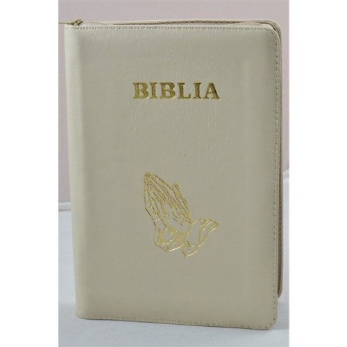 Biblia din piele, medie, bej, fermoar, simbolul maini in ruga, cuv. lui Isus cu rosu [053]
