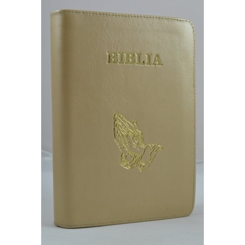 Biblia din piele, medie,bej sidefat cu maini, fermoar, aurita, cuv. lui Isus cu rosu [052]