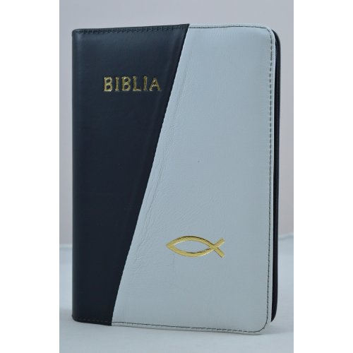 Biblia din piele, medie, bleumarin-alb cu maini, fermoar, aurita, cuv. lui Isus cu rosu [052]