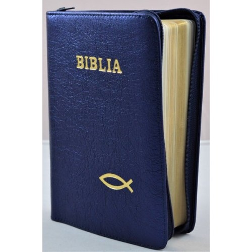 Biblia din piele, medie, bleumarin sidefat, fermoar, aurita, simbolul peste, cuv. lui Isus cu rosu [052]