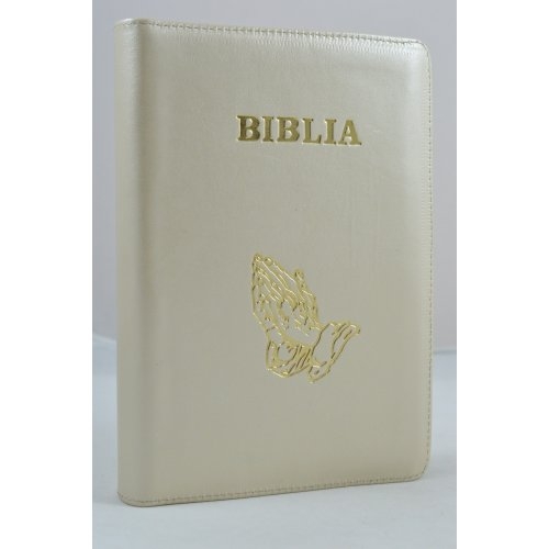 Biblia din piele, medie,crem sidefat cu maini, fermoar, aurita, cuv. lui Isus cu rosu [052]