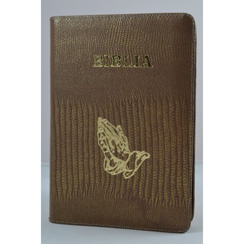 Biblia din piele, medie,culoare maro-auriu , fermoar, aurita,model maini in ruga, cuv. lui Isus cu rosu [052]