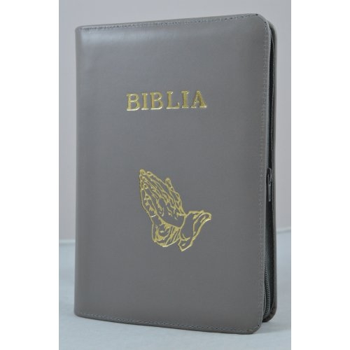 Biblia din piele, medie, gri, fermoar, aurita, simbol maini in rugaciune, cuv. lui Isus cu rosu [052]