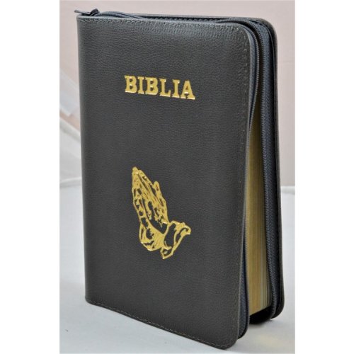 Biblia din piele, medie, gri, fermoar, aurita, simbolul maini in ruga, cuv. lui Isus cu rosu [052]