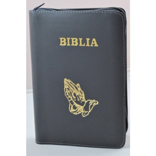 Biblia din piele, medie, gri, fermoar, aurita, simbolul maini in ruga, cuv. lui Isus cu rosu [052]