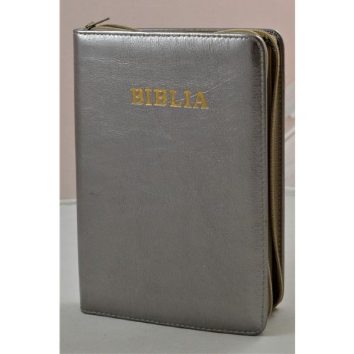Biblia din piele, medie, gri sidefat, fermoar, aurita, cuv. lui Isus cu rosu [052]
