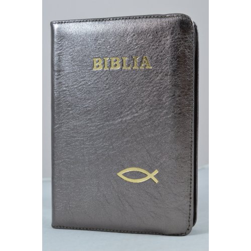 Biblia din piele, medie, gri sidefat, fermoar, aurita, simbol peste, cuv. lui Isus cu rosu [052]