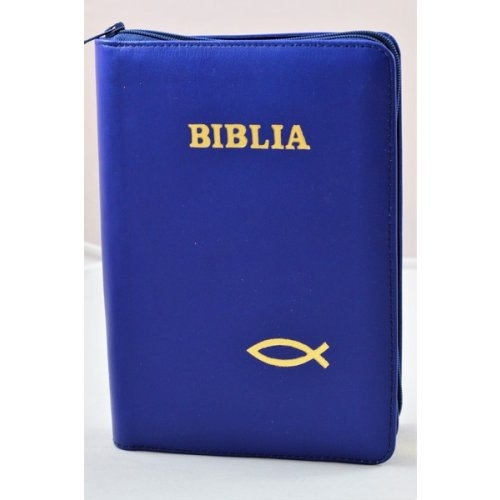Biblia din piele, medie, indigo, fermoar, aurita, simbolul peste, cuv. lui Isus cu rosu [052]