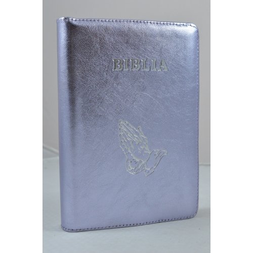 Biblia din piele, medie, lila sidefat, fermoar, argintata, maini in ruga cuv. lui Isus cu rosu [052]