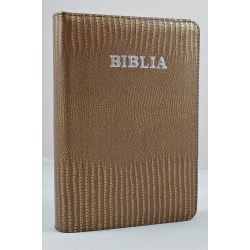 Biblia din piele, medie, maro auriu, fermoar, argintata, simpla cuv. lui Isus cu rosu [052]