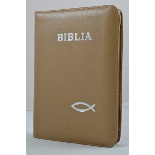 Biblia din piele, medie, maro deschis, fermoar, margini aurii, peste cuv. lui Isus cu rosu [052]