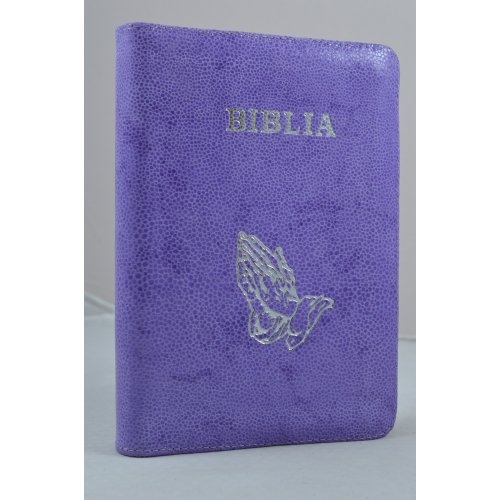 Biblia din piele, medie, mov, fermoar, argintata, maini in ruga cuv. lui Isus cu rosu [052]