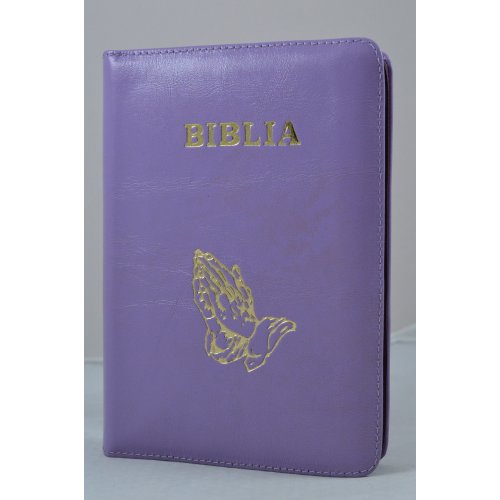 Biblia din piele, medie, mov, fermoar, aurita, simbol maini in rugaciune, cuv. lui Isus cu rosu [052]