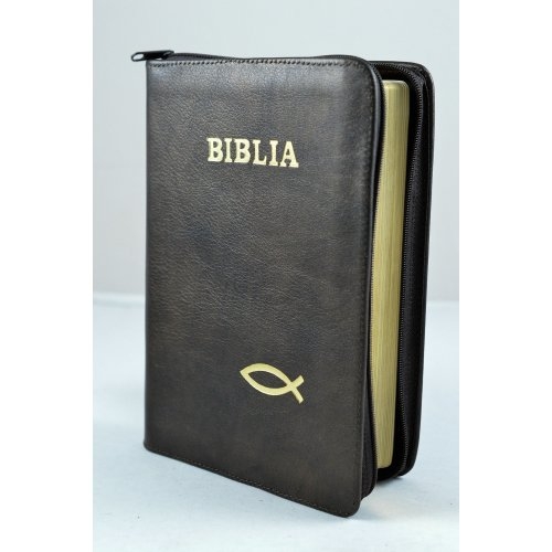 Biblia din piele, medie, neagra , fermoar, aurita, simbol peste, cuv. lui Isus cu rosu [052]