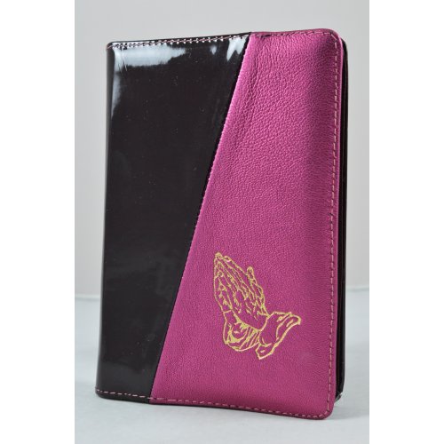 Biblia din piele, medie, negru lucios cu roz, fermoar, aurita, simbol maini in rugaciune, cuv. lui Isus cu rosu [052]