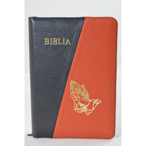Biblia din piele, medie, negru/rosie, fermoar, aurita, simbolul maini in rugaciune, cuv. lui Isus cu rosu [052]