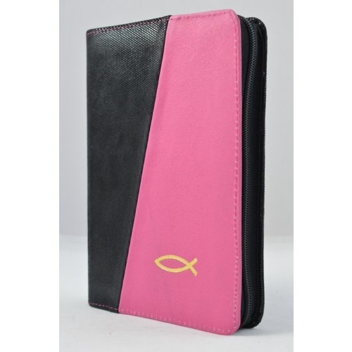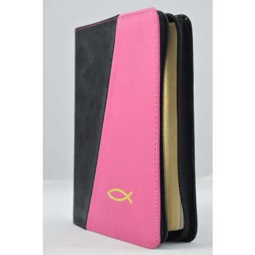 Biblia din piele, medie, negru / roz bombon, fermoar, aurita, cu peste, cuv. lui Isus cu rosu [052]