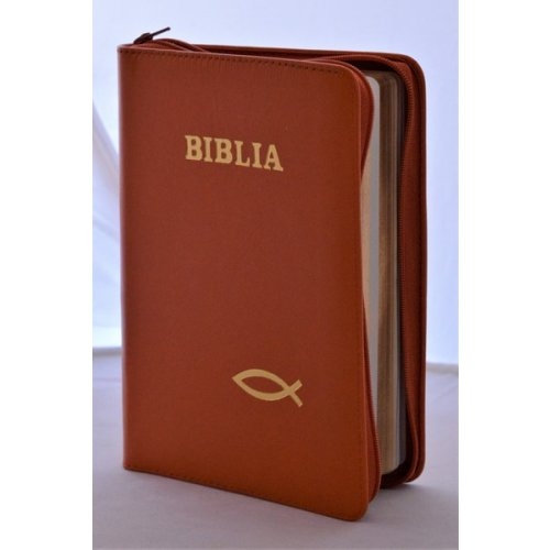 Biblia din piele, medie, portocalie, fermoar, aurita, simbolul peste, cuv. lui Isus cu rosu [052]