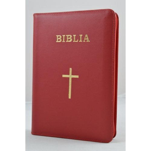 Biblia din piele, medie,rosu cu cruce, fermoar, aurita, cuv. lui Isus cu rosu [052]