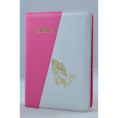 Biblia din piele, medie,roz bombon / alb, fermoar, aurita, cu maini gravate, cuv. lui Isus cu rosu [052]